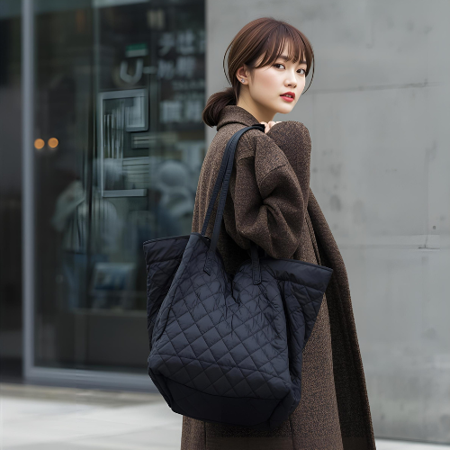 どんな装いにも自然に馴染む黒のキルティングトートバッグは、持つだけでコーディネート全体を引き締め、大人の女性らしい上品なスタイルを完成させてくれます。