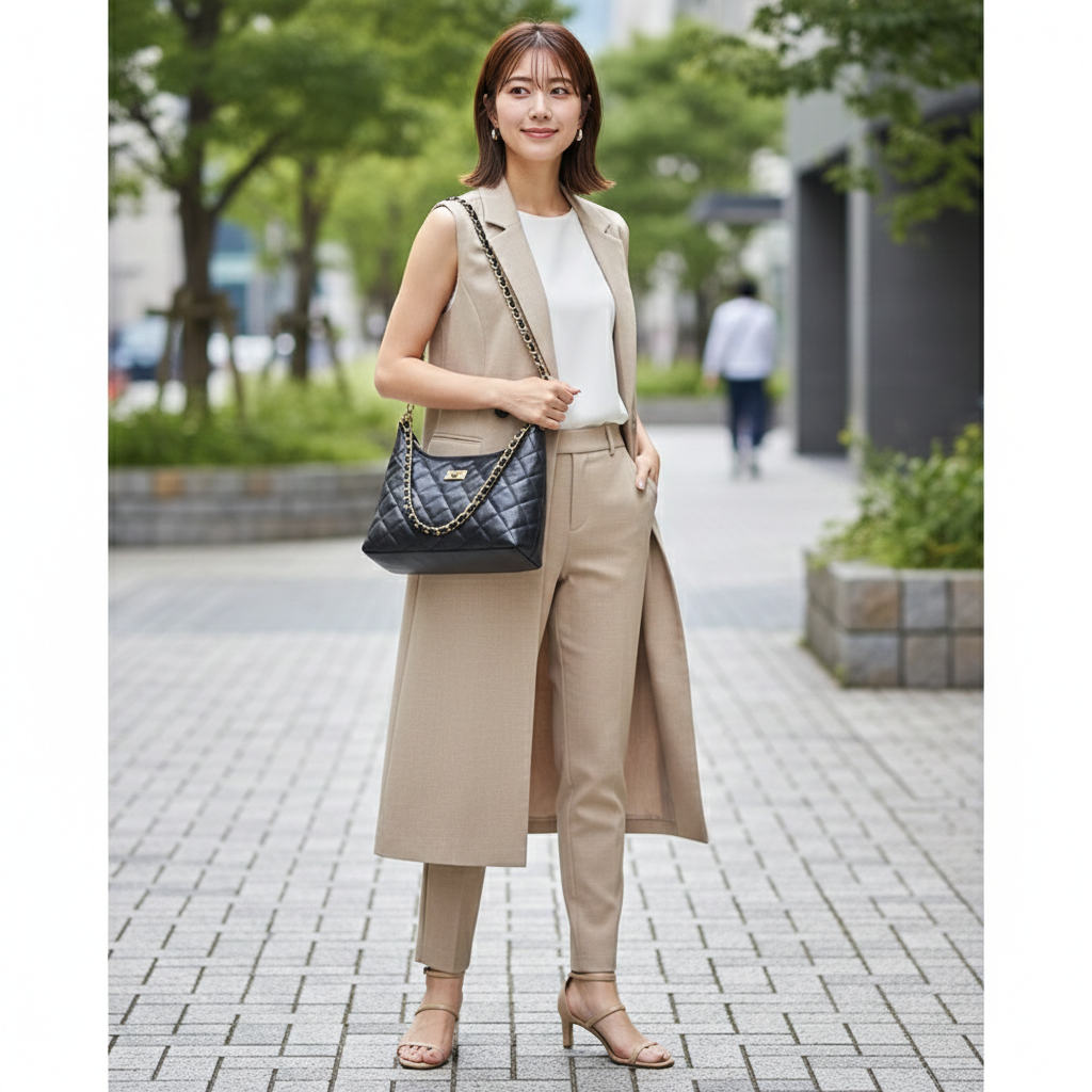 リネン調のジレに、あえてツヤのあるレザー調のキルティングを合わせることで、クラス感が一気に高まります。