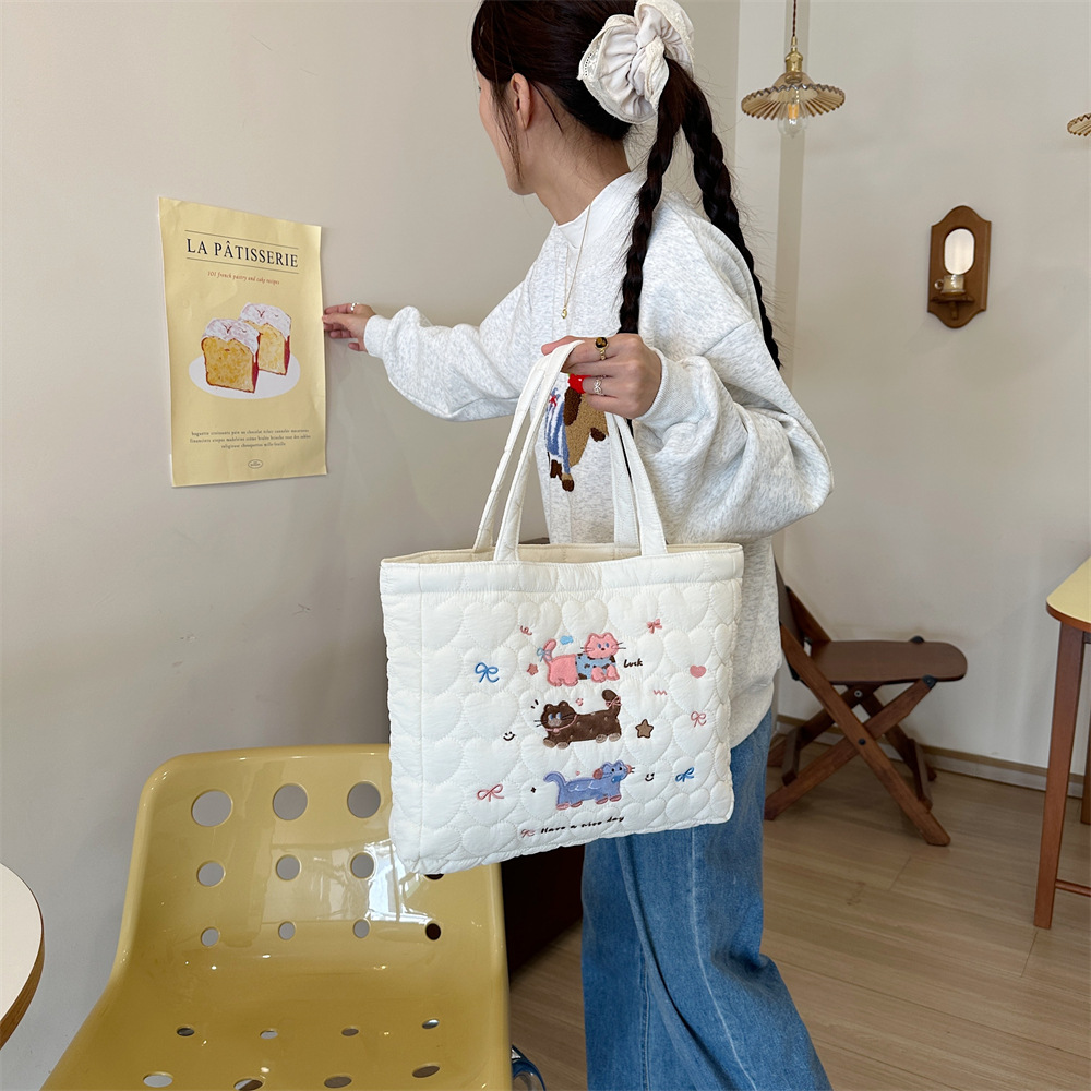 ふっくらとした立体的なキルティング加工が特徴的なトートバッグで、柔らかな素材感が魅力です。