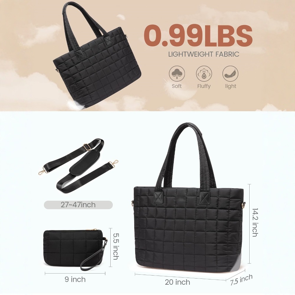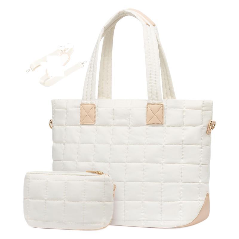 立体的な格子模様が美しいキルティングバッグです。 大容量32リットルのトートバッグは通勤や通学、週末のお出かけにも最適です。 取り外し可能なショルダーストラップ付きで2通りの持ち方が楽しめます。 同素材の便利なポーチも付属しており、小物の整理整頓にも便利です。 軽量で柔らかな素材を使用しているため、デイリー使いにぴったりな実用性の高いアイテムです。
