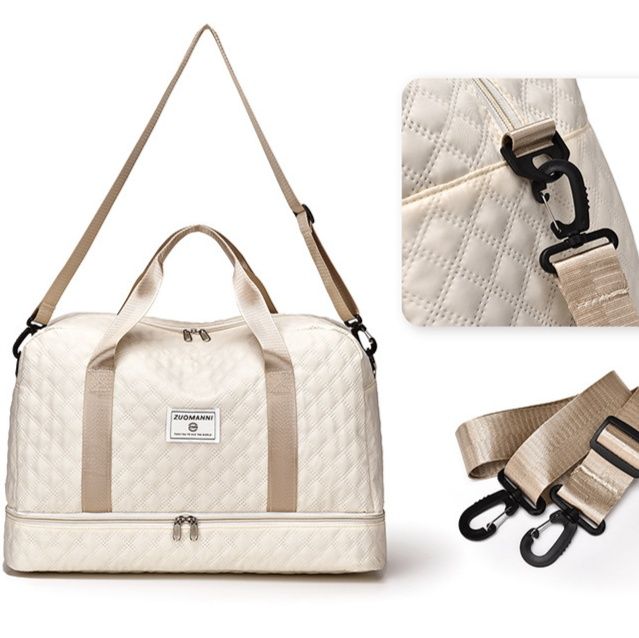 上品なダイヤ柄のキルティングステッチが特徴的なボストンバッグで、底部には独立したシューズ収納スペースを完備しています。